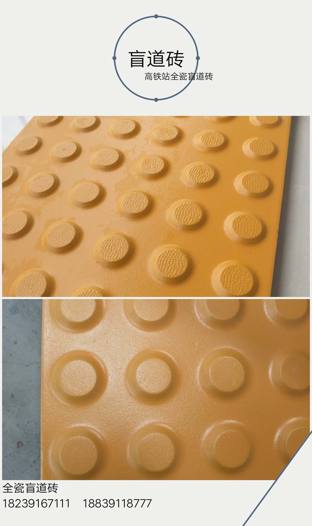 全瓷盲道磚、止步磚等產品具有規格齊全、色澤純正醒目、美觀大方、耐磨度高、抗低溫、抗沖擊等特點,廣泛適用于火車站、地鐵、體育場館、城建等公共場所。本產品已在北京西站、南站,鄭州西站擴建工程廣泛使用。