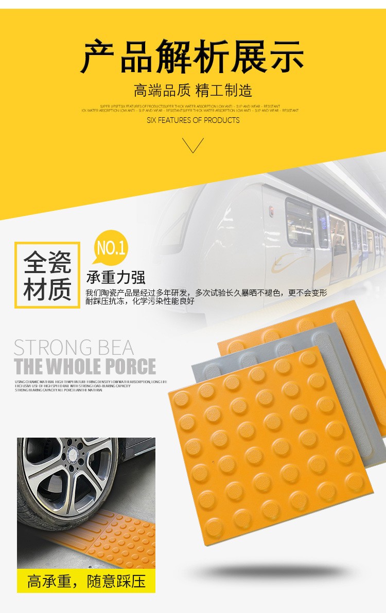 火車站站臺止步線國家標準寬度是600毫米寬,所以一般盲道磚規(guī)格都是600毫米的倍數(shù),比如有常用的300*300*20.300*300*25,以及400*400;300*400等。 這種盲道磚的成型方法是干粉制胚,壓制成型。