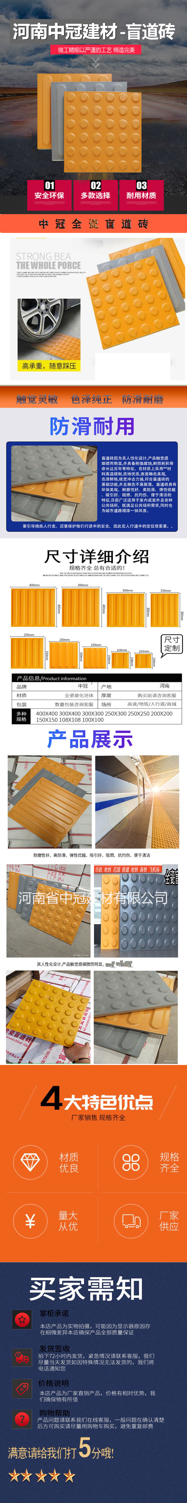 盲道磚規格:298*298、299*299、300*400、400*400、398*398(其它規格可以定制),白色安全線規格600*100